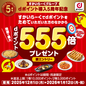 【12/1~1/12まで】すかいらーく×dポイント導入5周年記念キャンペーン開催!要エントリーで、dポイント最大555倍プレゼント♪詳しくはこちら!