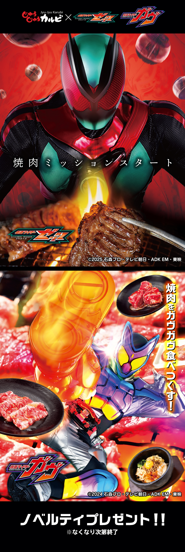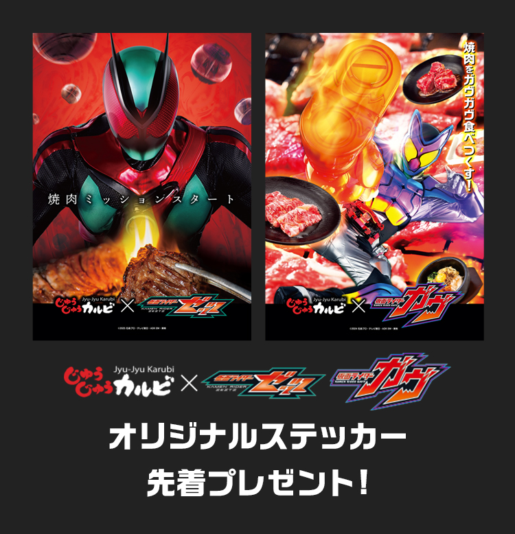 - 期間中、対象コースをご注文いただいた方に、じゅうじゅうカルビ×仮面ライダーゼッツ/仮面ライダーガヴのオリジナルノベルティ(ステッカー)を先着50,000名様にプレゼントをいたします。